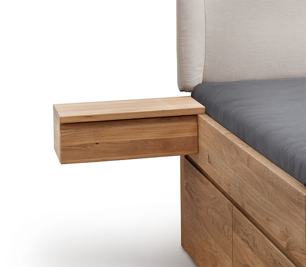 Diese Nachtkommode aus geöltem, massivem Wildeichenholz überzeugt durch ihr modernes Design und ihre schwebende Optik. Sie verfügt über eine integrierte Schublade mit Griffleiste. Die obere Deckplatte steht mi 2,5cm über für eine bessere Handhabung und eine elegante Linienführung. Die Nachtkommode ist perfekt abgestimmt auf unser Massivholzbett "CL55-KomfortPlus" aus Wildeiche.