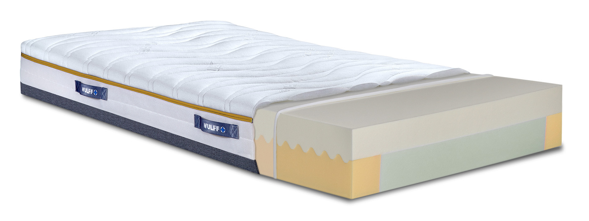 | Matratzenkern | 2-schichtig: Viskoelastischer Polyurethanschaum mit geringer Festigkeit (Raumgewicht 80kg/m³), stützender 2-teiliger Unterbau aus Polyäther-Kaltschaum mittlerer Festigkeit (Raumgewicht 55 kg/m³ und 33 kg/m³) |