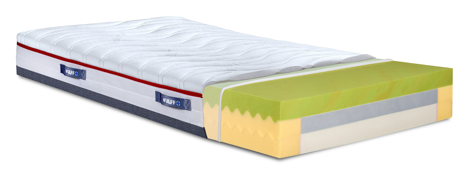 Matratzenkern 3-schichtig: Viskoelastische Polyurethanschäume mit mittlerer und hoher Festigkeit (Raumgewicht 85kg/m³), stützender 2- teiliger Unterbau aus Polyäther-Kaltschaum mit sehr hoher Festigkeit (Raumgewicht 55 kg/m³ und 33 kg/m³)